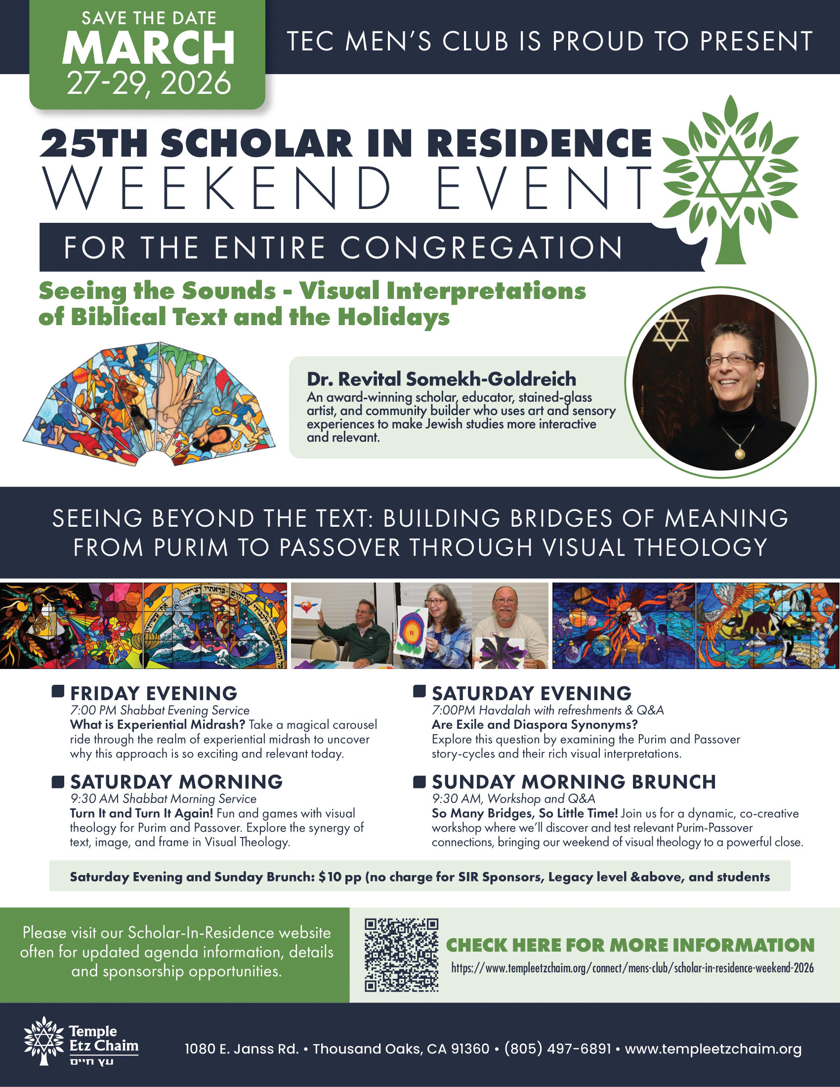 For over a quarter-century, the Scholar in Residence program has been a vital, foundational event, enriching the minds and spirit of our congregation. Your generous financial support is what keeps this essential program going and ensures it remains accessible and free of charge for every member of our community.