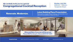 Please join us for our Congregational Cocktail Reception as we present the latest building plans to renovate and modernize our synagogue. Wine and Hors d’oeuvres will be served. Please RSVP to the Temple Main Office at (805) 497-6891. We look forward to seeing you there for this special event.
